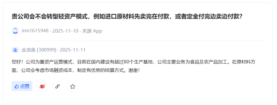 11月12日,三元股份发布通知布告,公司股票正在2025年11月7日、10日和11日持续3个买卖日,收盘价钱涨幅偏离值累计跨越20%。公司关心到,有报道称公司旗下子公司三元梅园发卖奶皮子糖葫芦相关消息。经核查,奶皮子糖葫芦为三元梅园推出的季候性产物,发卖周期仅几个月,收入规模占比极小。敬请泛博投资者留意风险,投资。近日,太太乐取小米结合,借帮小米生态及小爱AI能力,太太乐将智能语音交互、个性化菜谱定制、多场景触发等功能深度融合,无效处理了吃什么的决策难题。太太乐通过OTT创意开机告白、手机APP开屏、小爱同窗场域硬广等焦点资本,实现了从大屏到小屏、从语音到视觉的多入口品牌及智能体引流。(美通社)近日,Beyond Meat发布三季度财报。财报显示,公司前三季度营收累计下滑14。37%,净吃亏进一步扩大。其预测的四时度发卖额低于市场预期。为缓解业绩环境,别样肉客选择转型。公司首席施行官Ethan Brown还暗示,公司将冲破“动物肉”的局限,拓展营业范畴以供给更多立异卵白处理方案,寻求新的增加模式。(东方财富网)近日,三全×九芝堂结合上新润系列汤圆,包罗红枣银耳红糖汤圆和桃胶玫瑰牛奶汤圆两种口胃。据引见,新品均添加黄冰糖,不含反式脂肪酸,此中红枣银耳红糖汤圆选用广西一级红糖和新疆黄金产区若羌红枣,搭配清甜银耳,糯滑回甘;桃胶玫瑰牛奶汤圆添加云南丽江桃胶和云南沉瓣红玫瑰,搭配纯牛奶入皮,醇厚嫩滑。(三全食物)。